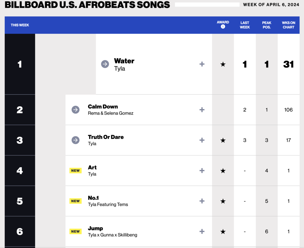 Tyla’s debut album secured the 24th position on the Billboard 200 chart by amassing 24,000 album equivalent units in its inaugural week. It had the second-highest first-week album sales for an African artist, following Burna Boy’s “Love, Damini.” The album’s success was largely attributed to the breakout hit “Water.”