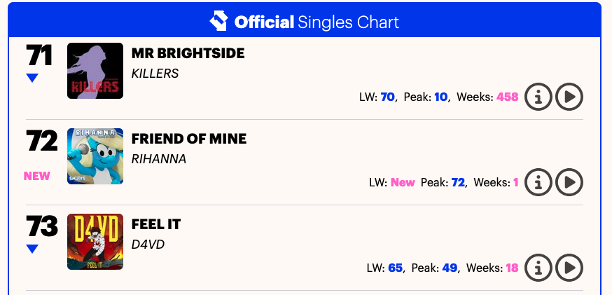 Barbadian superstar Rihanna may be gearing up for a major box office moment with The Smurfs this summer, but her latest musical offering from the film isn’t striking the chord many expected. The new single “Friend of Mine”, penned and performed by the Fenty mogul for the animated feature, debuted at a surprising No. 72 on the UK’s Official Singles Chart — marking her lowest entry on the chart since 2016.