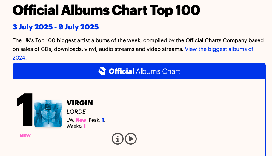 With a U.K. and Ireland arena tour on the horizon and dancehall echoes woven into its fabric, Virgin is poised to become one of Lorde’s defining works — both critically and commercially. Its debut at No. 1 on three major markets — the U.S., U.K., and Australia — signals not just a return, but a reinvention. Lorde is no longer the prodigy from Pure Heroine — she’s now a global chart force who, more than a decade into her career, is still finding new ways to captivate, collaborate, and conquer.
